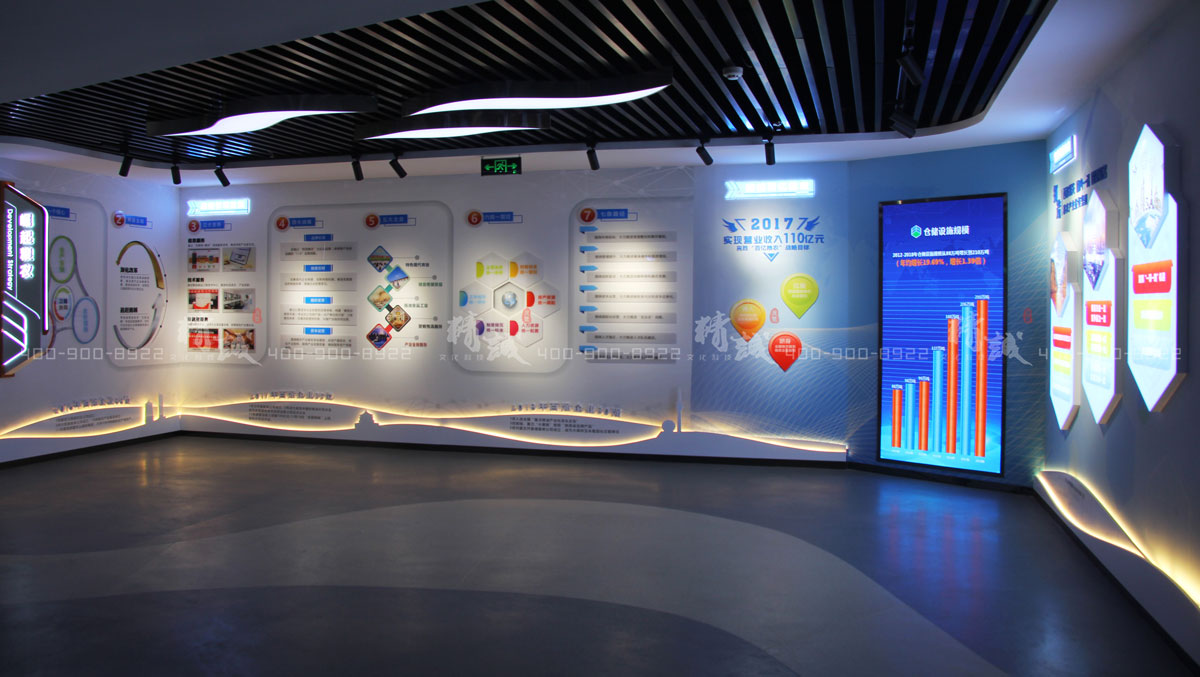 该板块采用墙面图文展板+多媒体显示屏,并结合细节化背发光式场景墙面装饰,以顶墙地三面结合的画面形式,对集团的发展、荣誉进行展示,达到视觉的丰富感和连贯性。