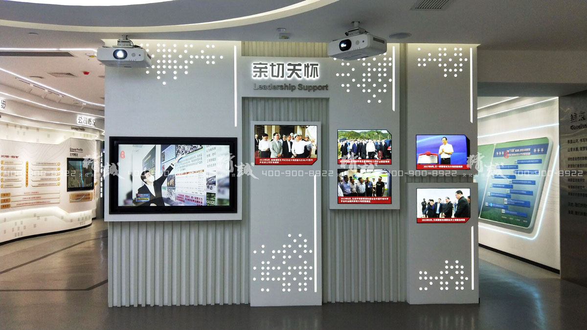 亲切关怀部分通过电子屏和灯箱图片展示了大地集团发展过程中,各级领导的亲切指导和关怀的影响资料,激励着作为土地美学复兴者的大地人牢记“还老百姓一片青山绿水”的初心。