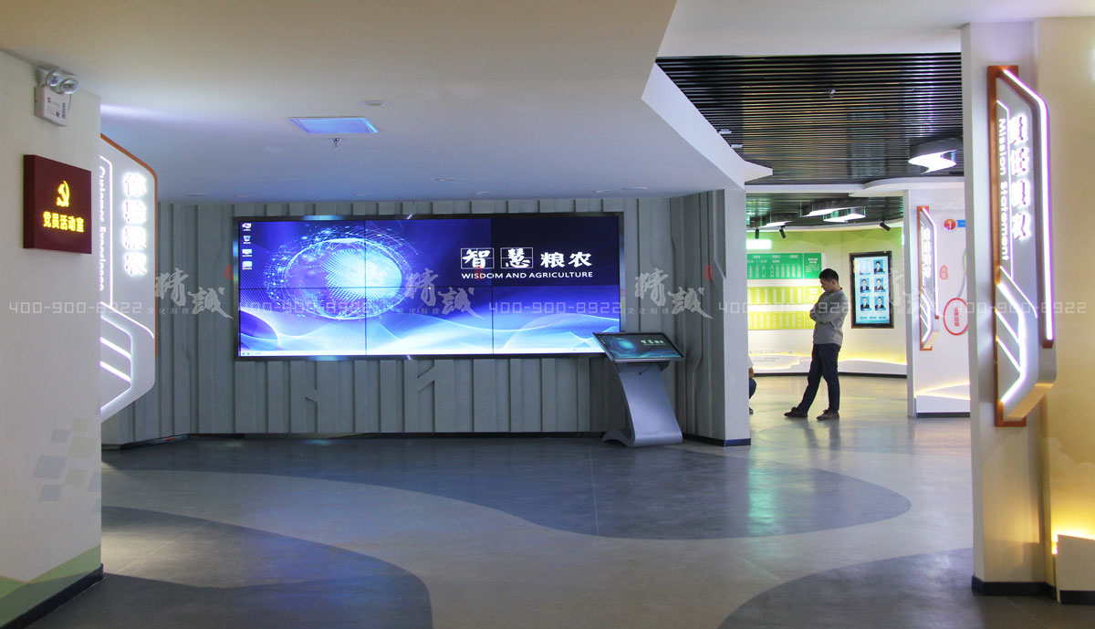 采用液晶显示屏打造一面荣誉墙,展现员工之星、企业之星、产业之星等内容。格栅造型隔断,展现粮农之歌,有效隔开空间并考虑展厅的视觉通透性。