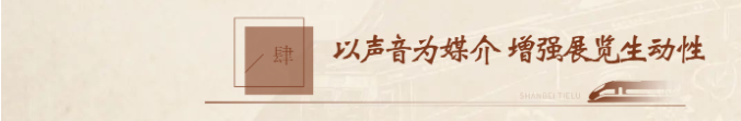 策展团队通过对当地民俗文化的研究,针对每一展厅的主题和内容,特别定制了不同的音效,着重选取了陕北民歌中的唢呐、绞煤号子、赶牲灵、安塞腰鼓等音乐,以进一步增强展览的生动性,带给参观者全方位的视听感受。