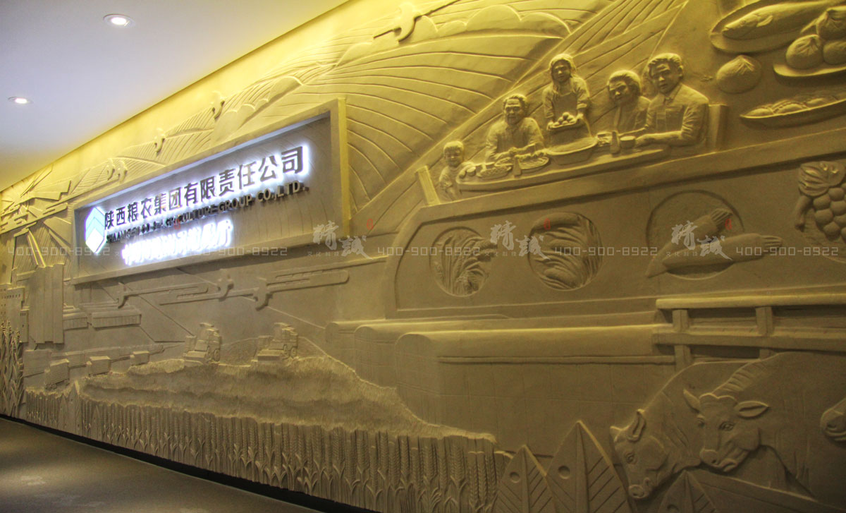 步入展厅入口,整面砂岩墙通过几组不同场景的浮雕组合,展示了粮农产品从田间到餐桌的全生产链,给人沉稳的视觉体验,在朝阳的映衬下,画面寓意粮农集团代表着中国粮食行业即将迎来辉煌而崭新的未来。浮雕画的形式,彰显集团的农业基石地位,大气恢宏中彰显集团不凡实力。