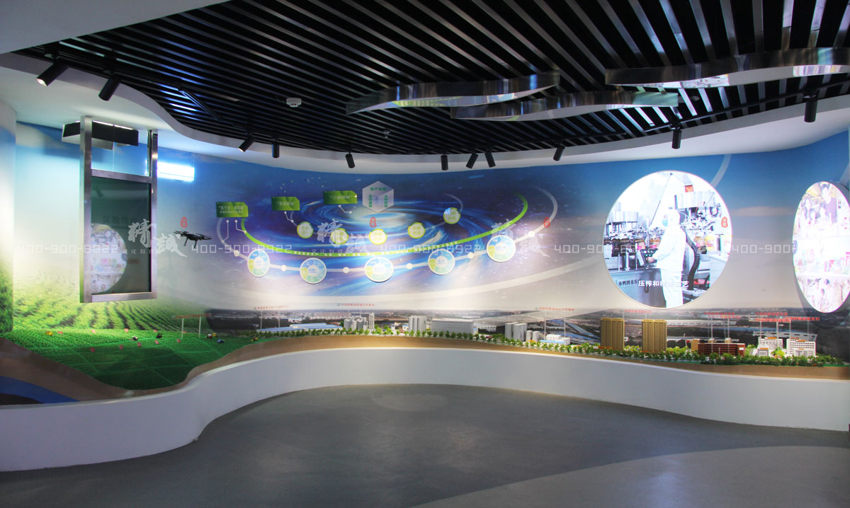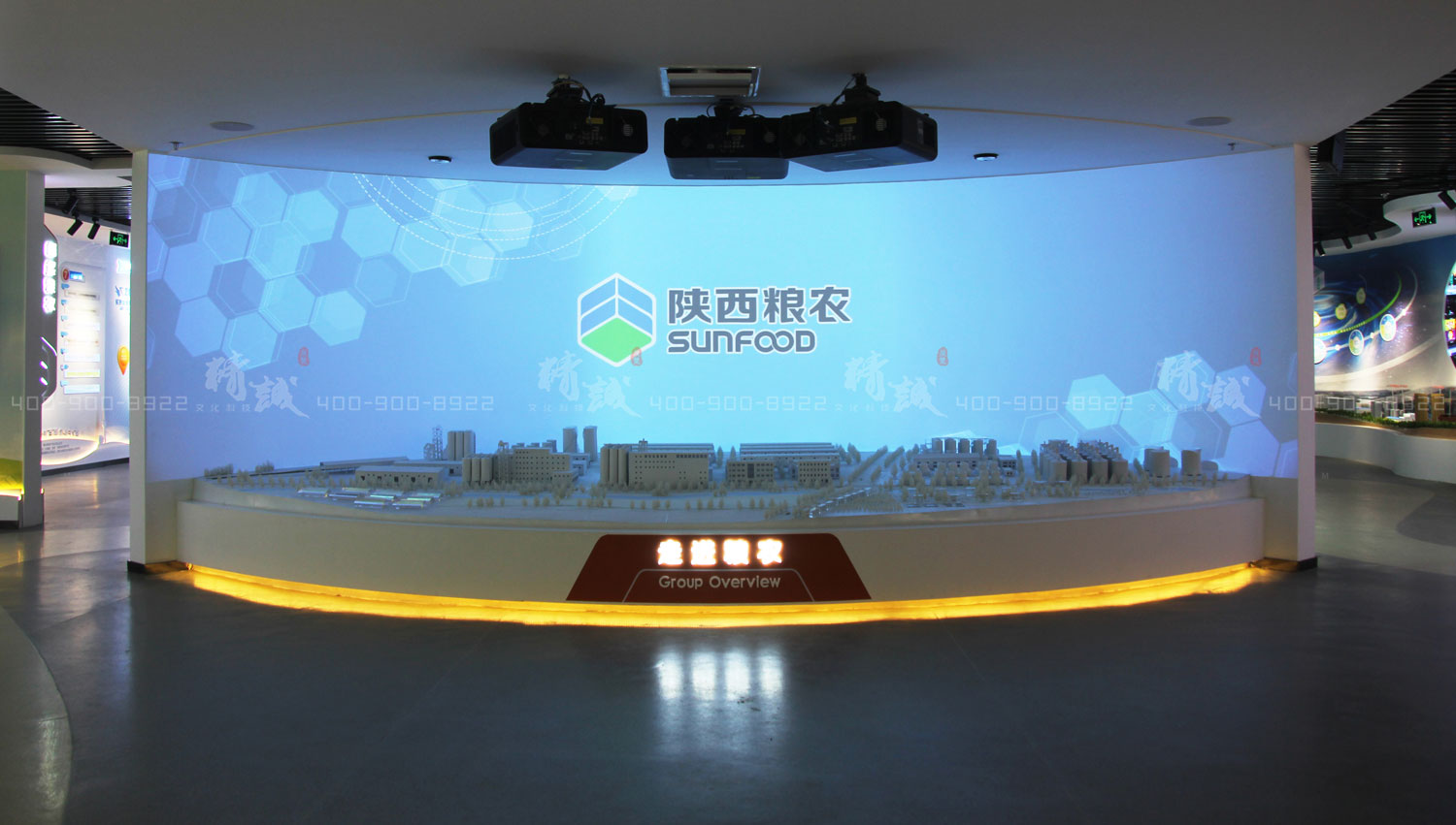 利用数字投影升级沙盘,配合弧幕投影,以声光电联动的效果播放粮农集团宣传片,给观者以强烈的视觉震撼。