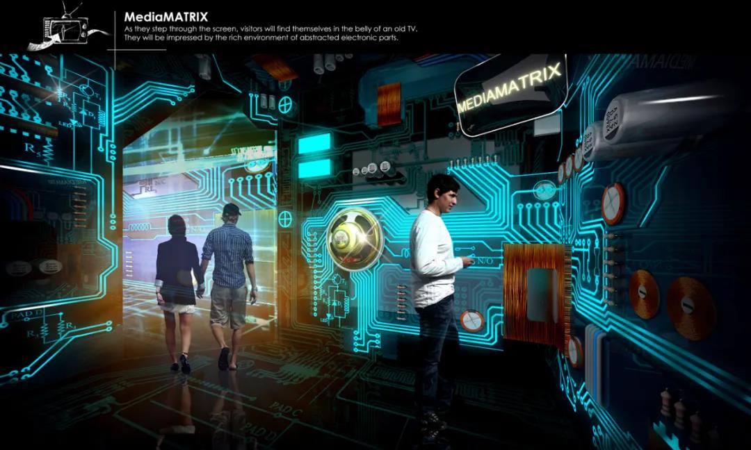 媒体矩阵:当参观者走过屏幕时,他们会发现自己置身于一台旧电视里,他们将会被抽象的电子部件所构成的丰富环境所震撼。