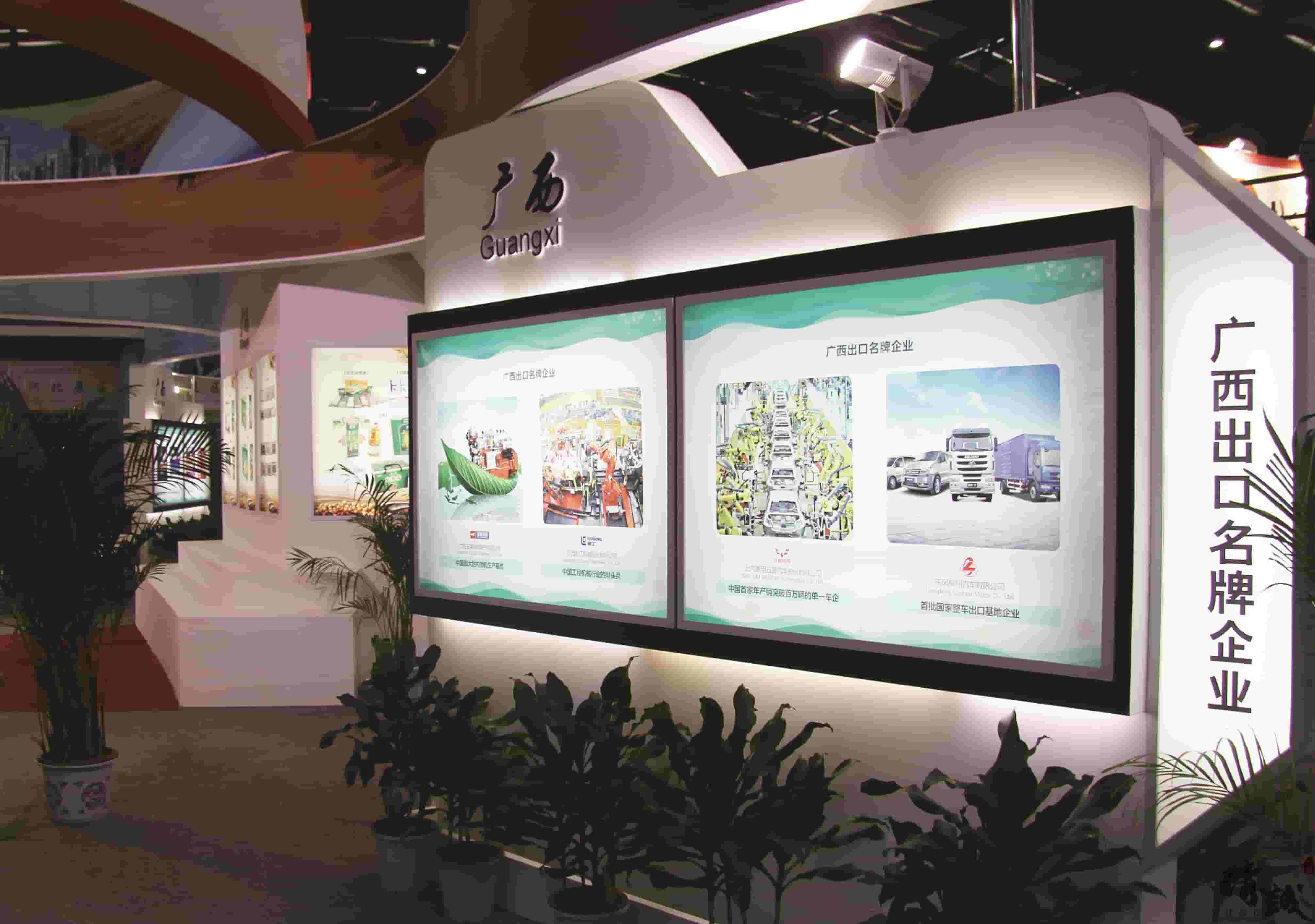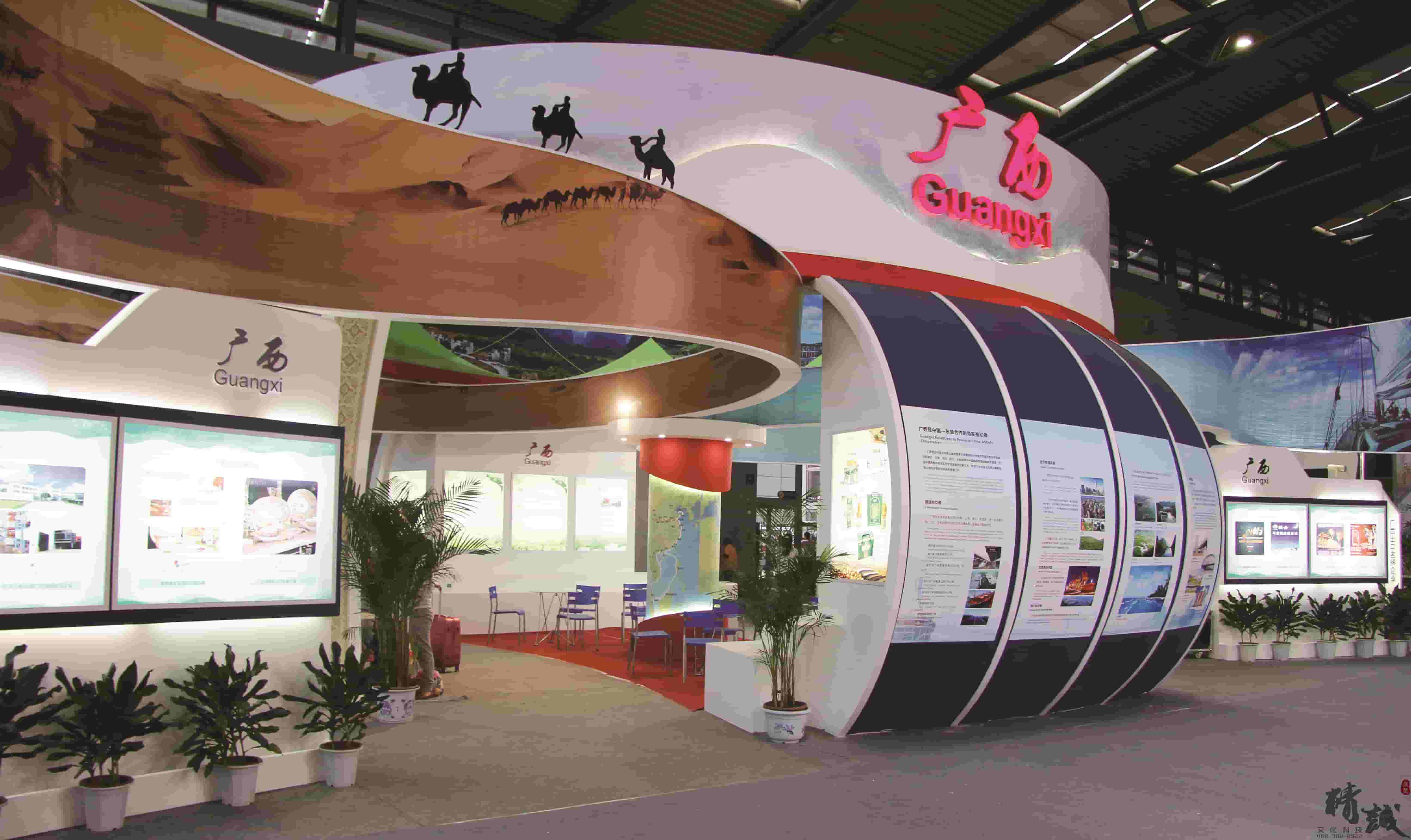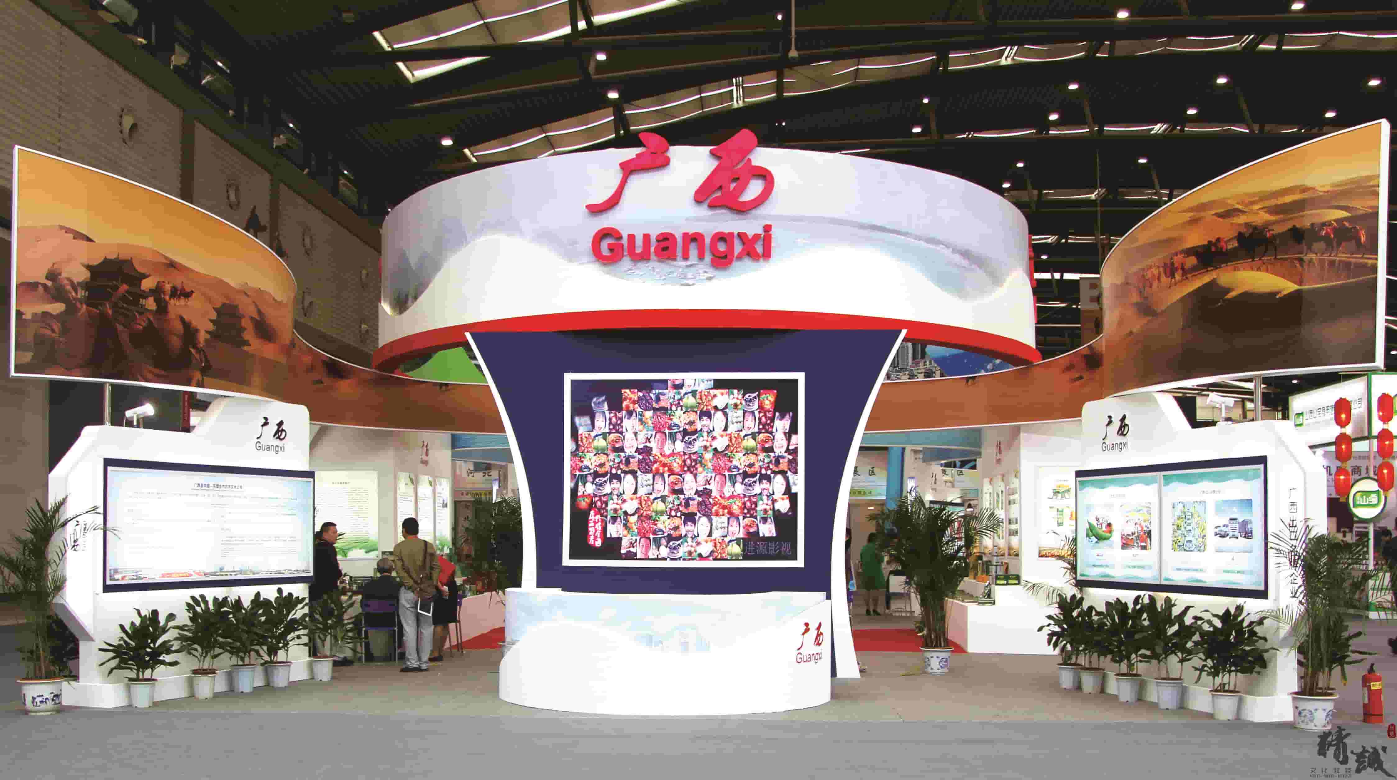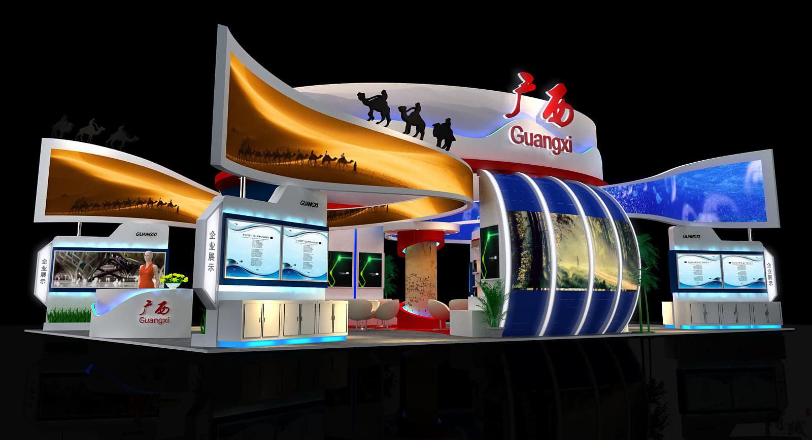 “一带一路”是促进共同发展、实现共同繁荣的合作共赢之路,是增进理解信任、加强全方位交流的和平友谊之路,为了突出“21世纪海上丝绸之路”的中心主题,设计师运用现代,新颖的造型,以大幅度的眉板,向展台两侧延伸,“一半海洋,一半陆地”,给参观者耳目一新的视觉冲击。中间波澜起伏的山峦机理又是一大点睛之笔。融合灯光的巧妙设计,更直观的体现了广西大好河山的名族风光。