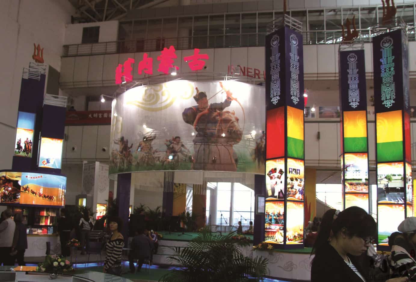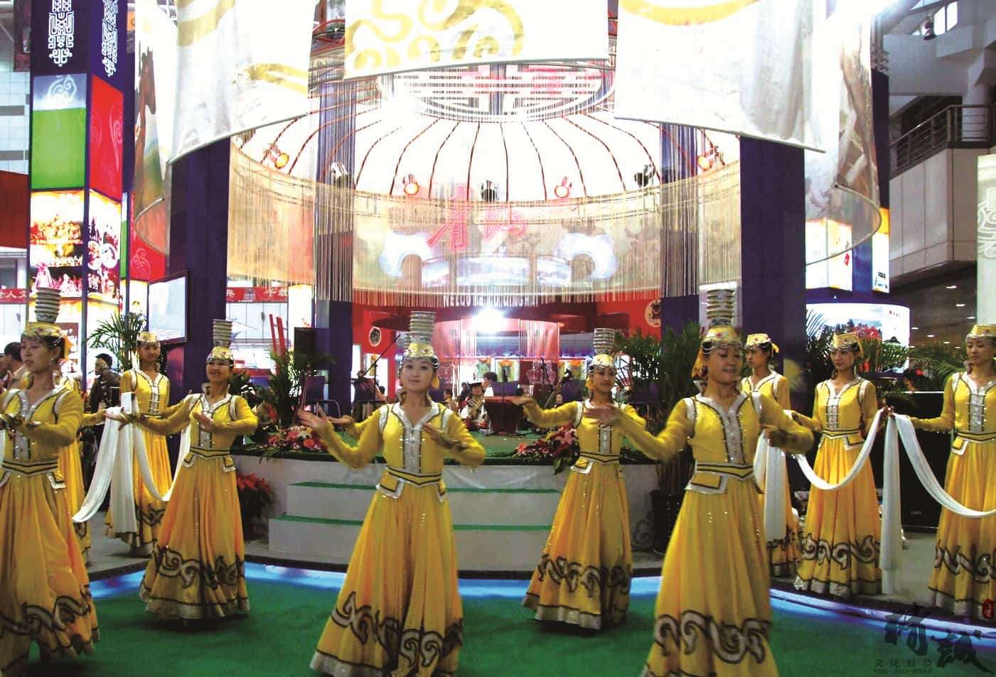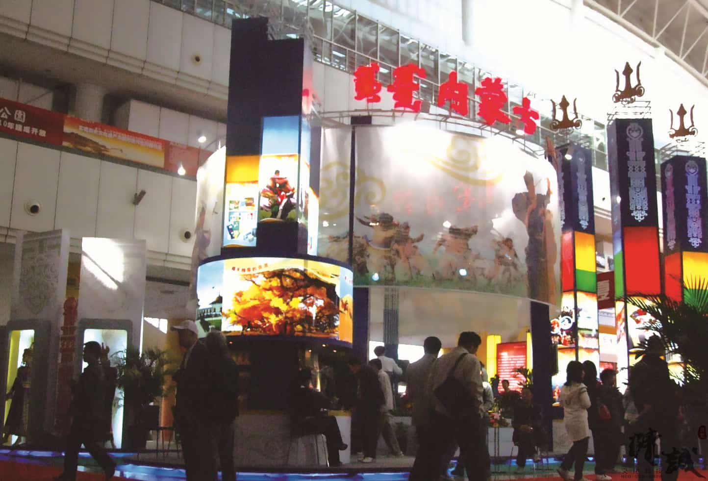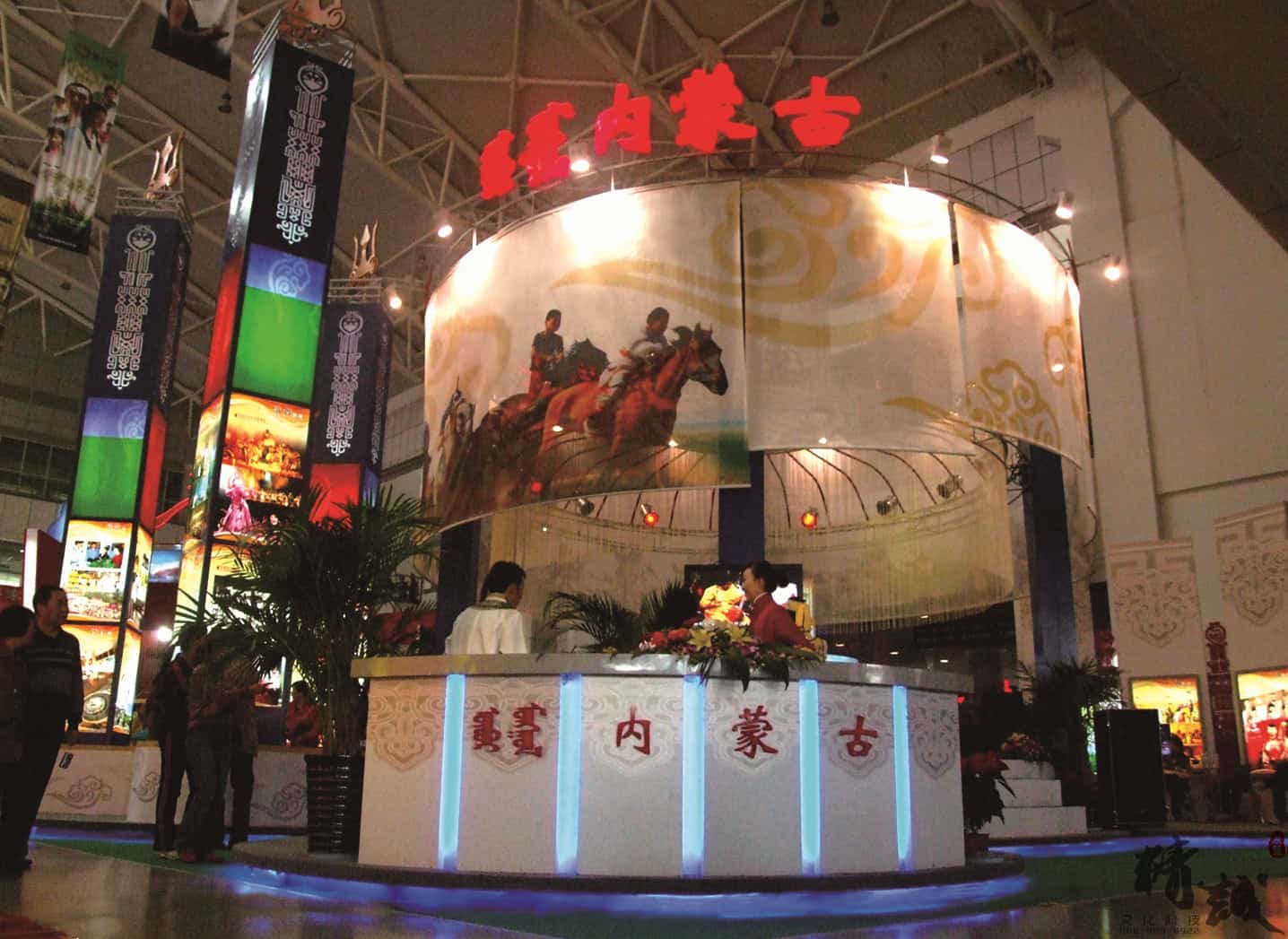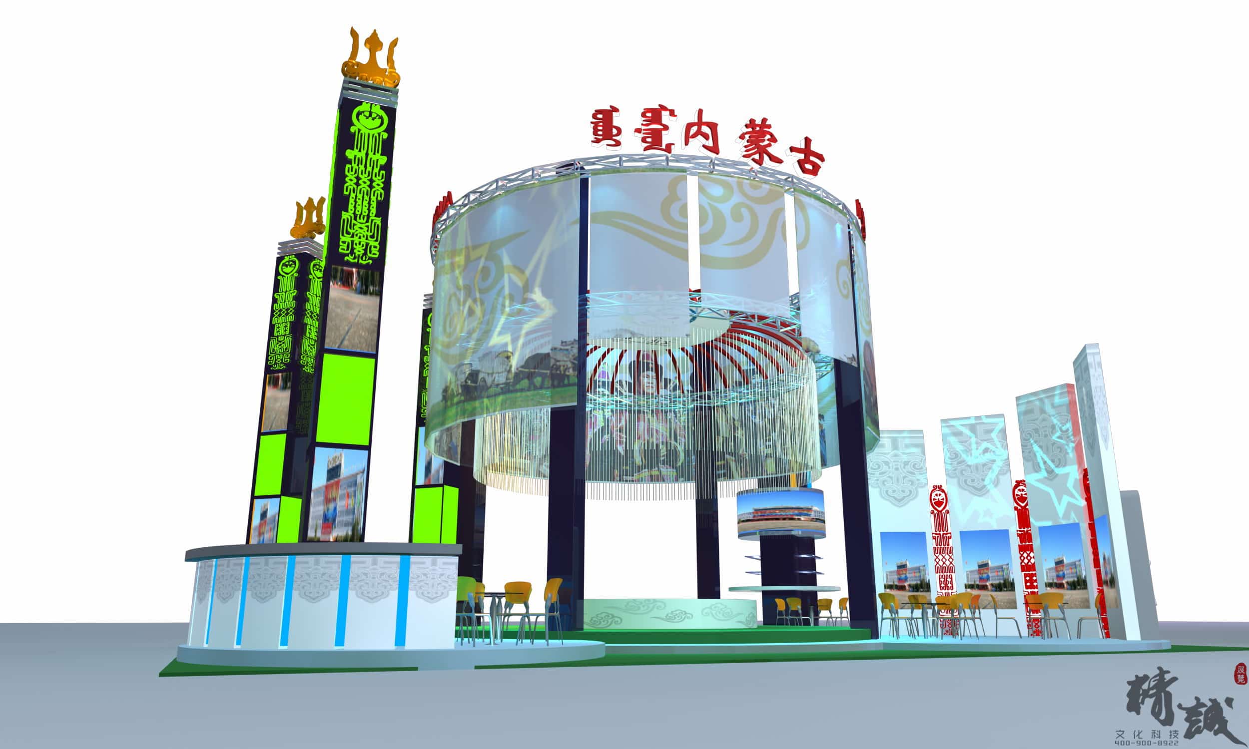 展位设计总体美观大方,图文并茂,富有民族特点,采用声、光、电相结合的现代展示手法,做到“动态感”和“时代感”的完美结合。现场的载歌载舞的热情气氛,展示出了草原的文化和独具北疆特色的旅游基地。