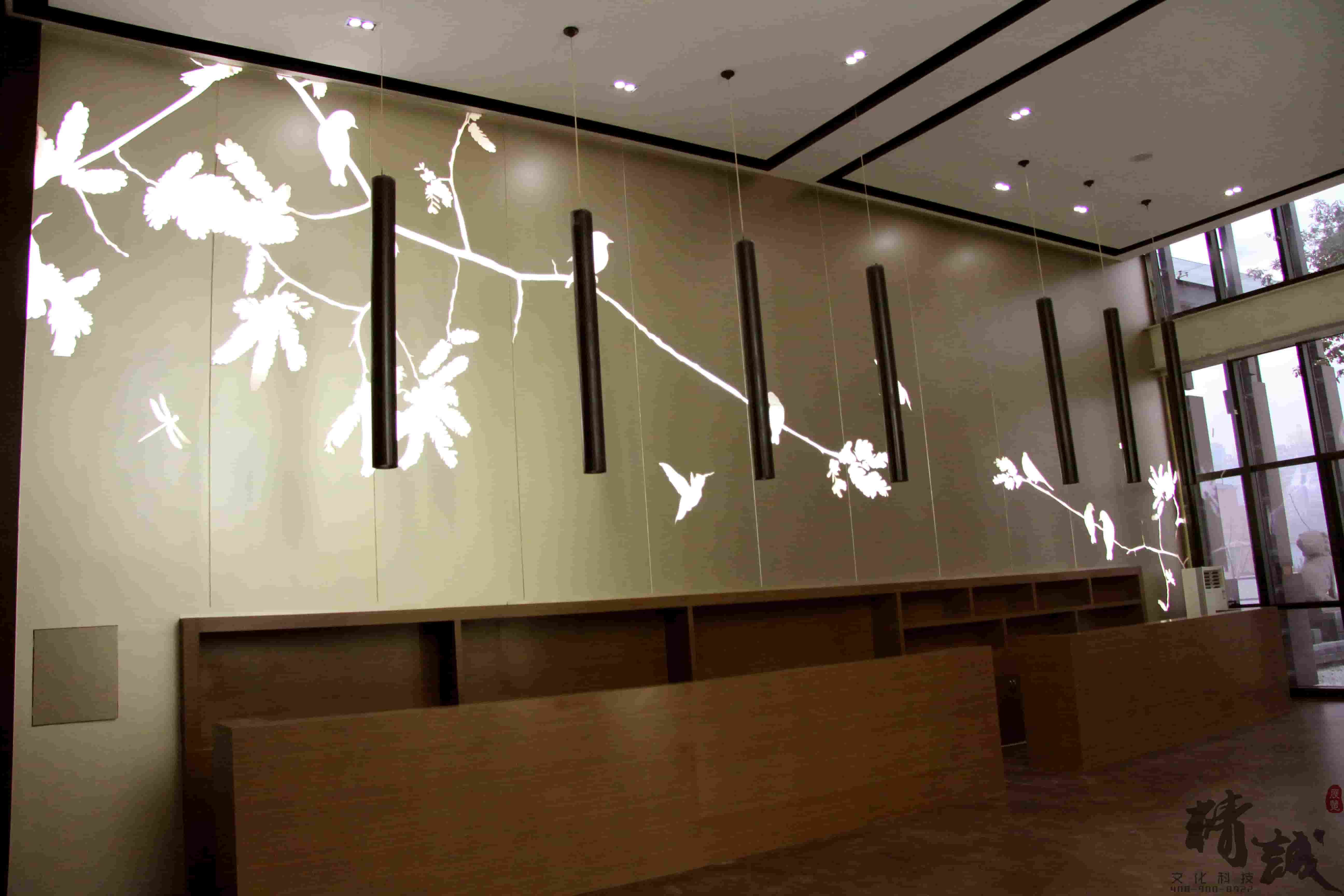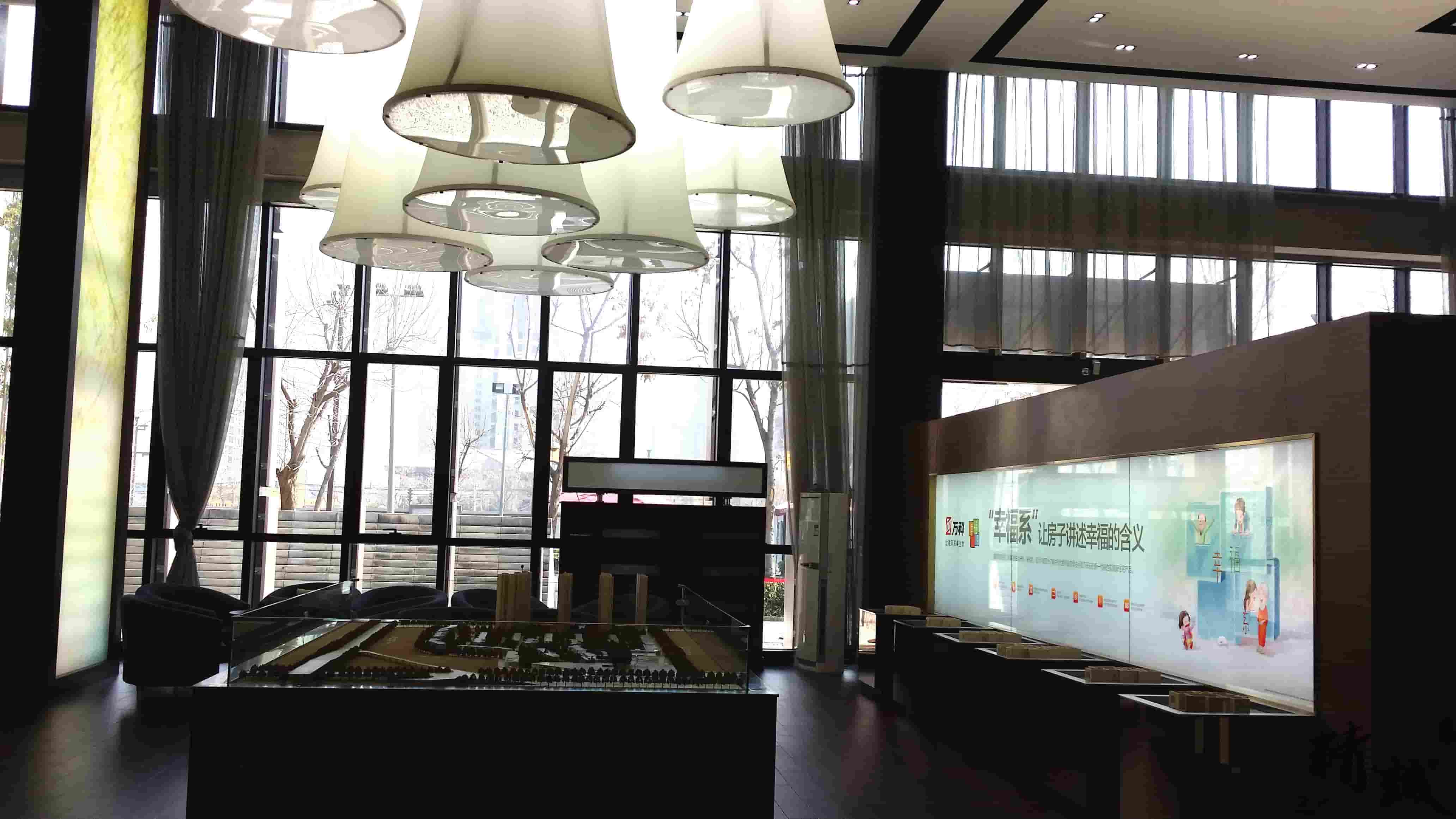 对于万科金域东郡的装饰装修设计整个展厅色调以稳重的棕色为主,用适当的金色作为点缀,显得整个展厅高端、大气。大厅顶部悬挂的创意灯饰和墙面花语林鸟的灯光修饰,则为展厅带来一丝清幽的新意,犹如清风拂面。