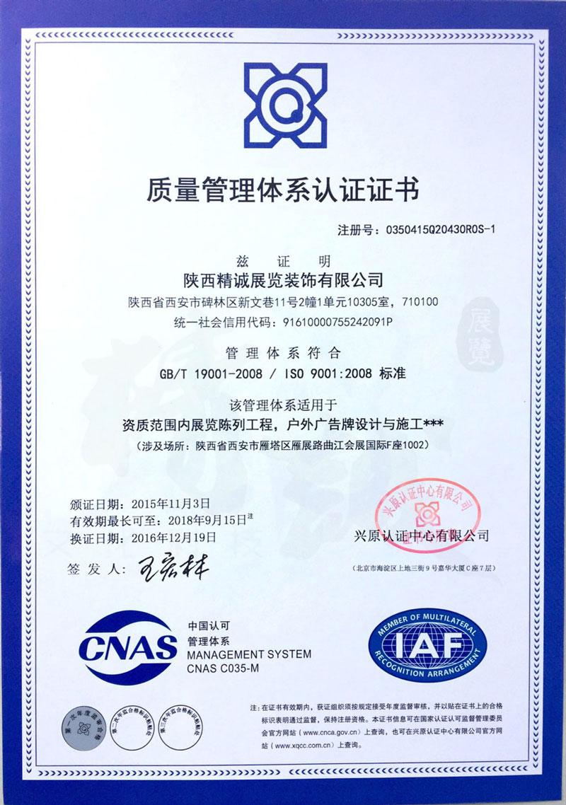 - 陕西香蕉视频网站在线观看展览装饰有限公司质量管理体系认证证书 -